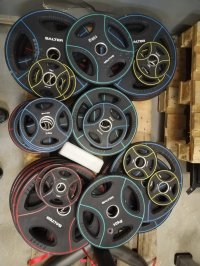 Muutaman vuoden käytössä olleet Salterin 25 kg kahvalliset TPU levypainot 50mm. 10 kpl. Myydään settinä.